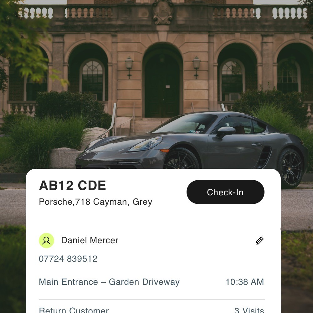Pierfront matches number plates to returning customers, surfacing profiles, preferences, visit history and special notes automatically.